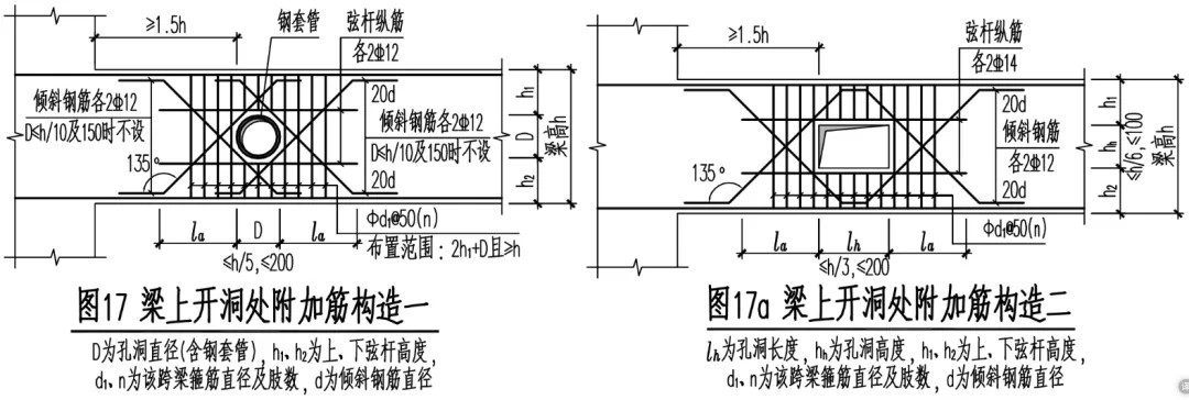 以本工程的消防管道穿梁施工為例,依據(jù)設(shè)計(jì)構(gòu)造圖以及《混凝土結(jié)構(gòu)構(gòu)造手冊(cè)》相關(guān)要求,梁上開(kāi)洞的尺寸位置及配筋構(gòu)造,要點(diǎn)如下。